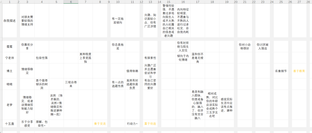 做了一个excel表格统计了一下我的朋友们对我的描述,发现朋友们对我的描述大概集中于我进行自我描述的五条中,又统共可以归入四大类,除此之外还有一些零零散散的特征性描述。而且令我惊喜的是朋友们的描述虽然指向了不同方面,但大部分是准确的,当然也包含了一些我也没有想到的方面。
