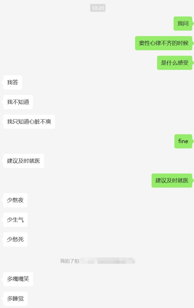 因为这几天熬夜而心口不舒服,产生了一些躯体化的症状。出于对一个医学生的尊重,我去问了问。